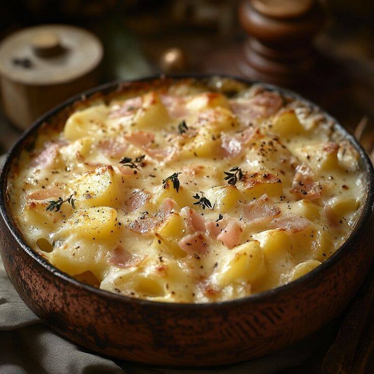 - Disposez une couche de pommes de terre dans un plat à gratin, ajoutez les lardons et les oignons, puis répétez.