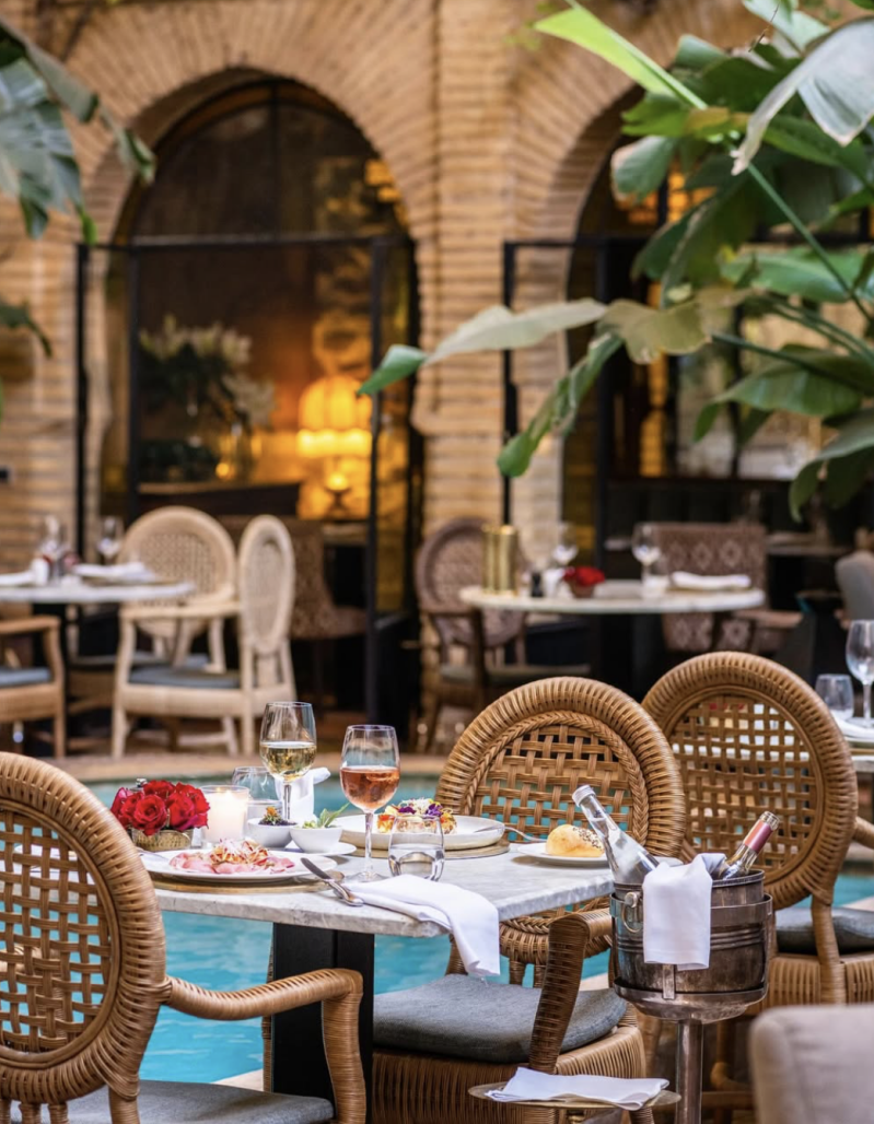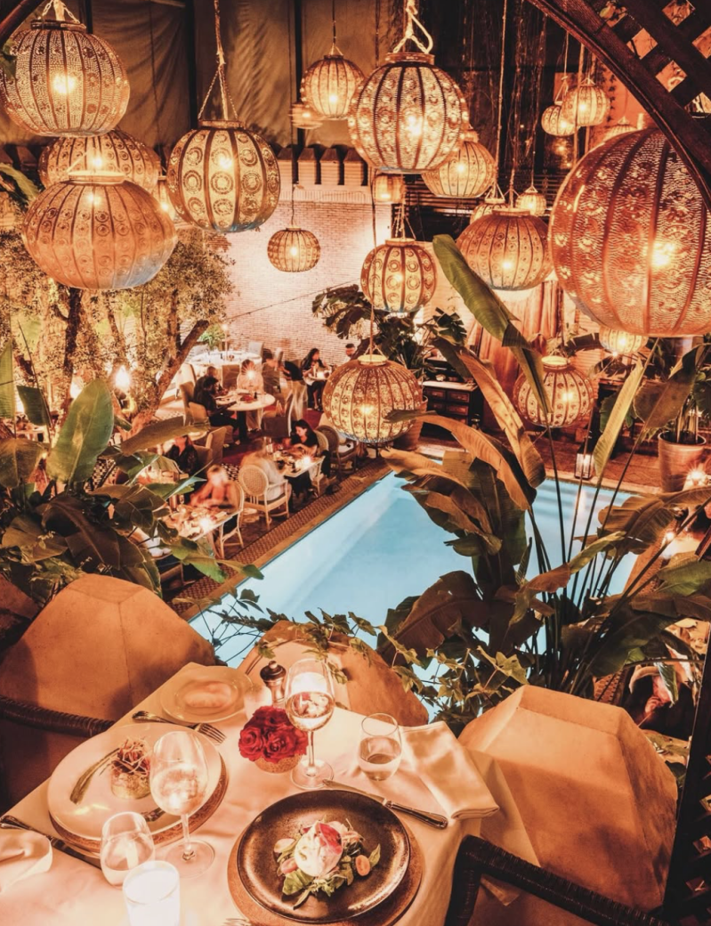 El Fenn est bien plus qu’un simple riad : c’est une immersion dans un univers bohème et luxueux. Leur rooftop offre une vue imprenable sur la médina, idéale pour admirer les feux d’artifice. Pour le réveillon, le menu inclut des huîtres gratinées (300 MAD), un risotto au safran et gambas (350 MAD) et un soufflé au Grand Marnier en dessert (200 MAD). Un choix parfait pour une soirée mémorable sous les étoiles.