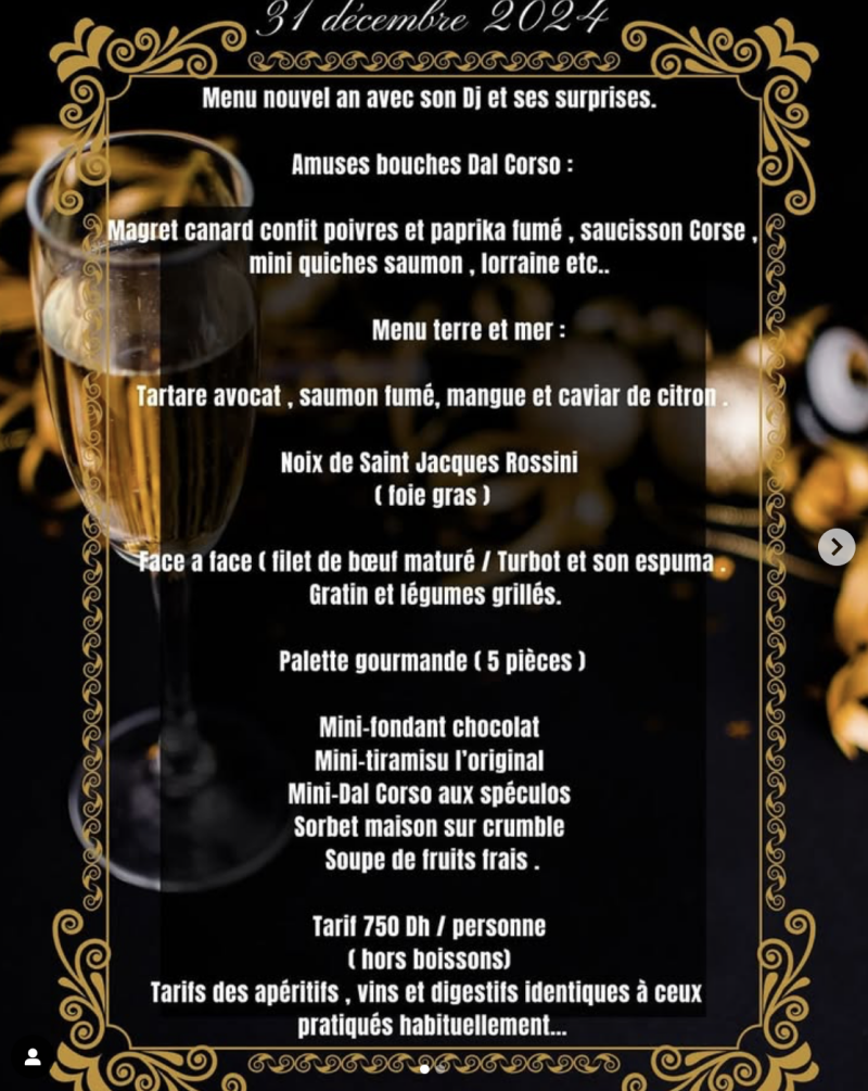 Dal Corso se distingue par sa cuisine mêlant traditions corses et italiennes, offrant une expérience gastronomique authentique et chaleureuse. Situé en plein cœur de Guéliz, ce restaurant au décor élégant séduit les amateurs de saveurs méditerranéennes. L’ambiance intimiste et conviviale est idéale pour une célébration du Nouvel An sous le signe du raffinement et du partage.