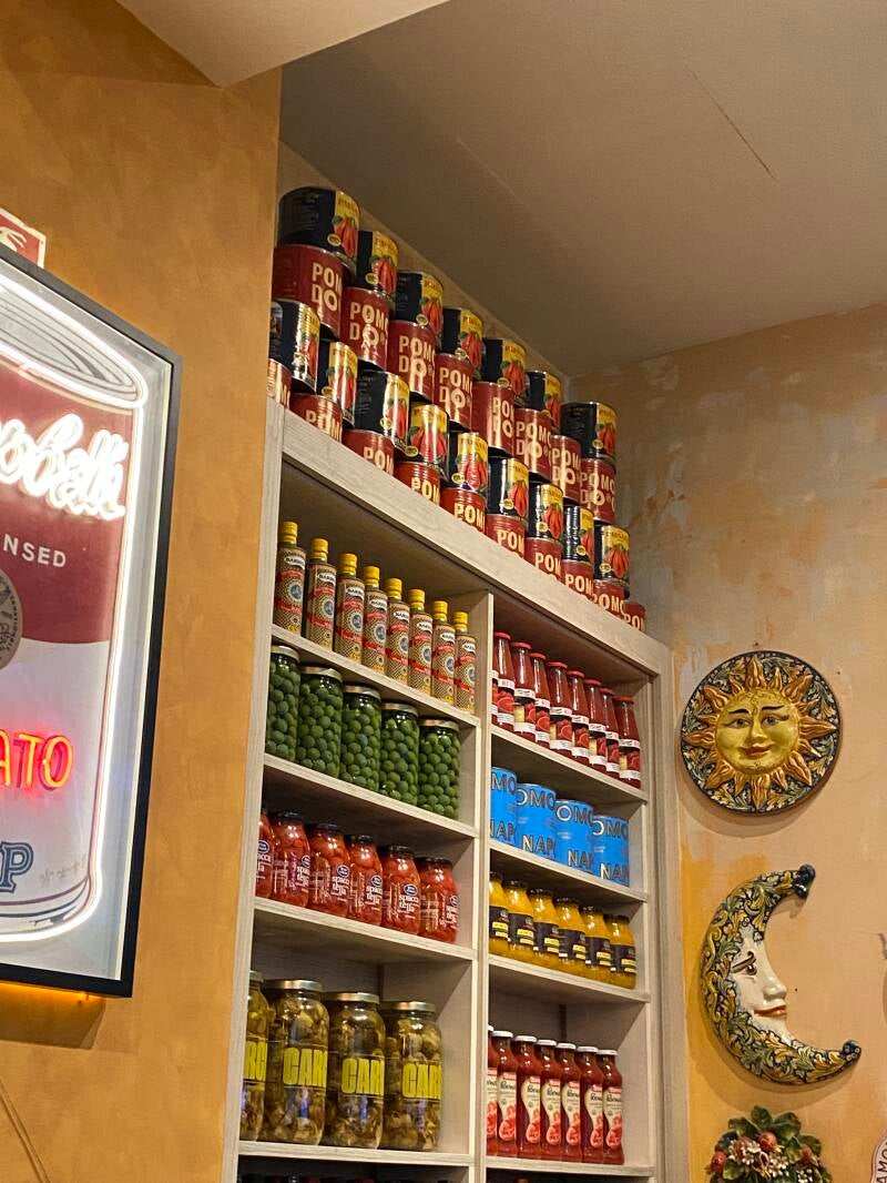 L'espace est immense, avec des grandes tablées familiales aux nappes blanches, des murs ornés de briques apparentes et des luminaires suspendus qui ajoutent une touche chaleureuse. Ce qui frappe le plus, c'est l'exposition des produits : l'huile d'olive dans des belles jarres, de grosses olives vertes dans des bocaux, de la vaisselle comme à Naples, des meules de parmesan prêtes à être râpées sur des pâtes fumantes et une cuisine ouverte qui permet d'observer les pizzaiolos à l'œuvre. Une immersion totale dans l'authenticité de la cuisine italienne !