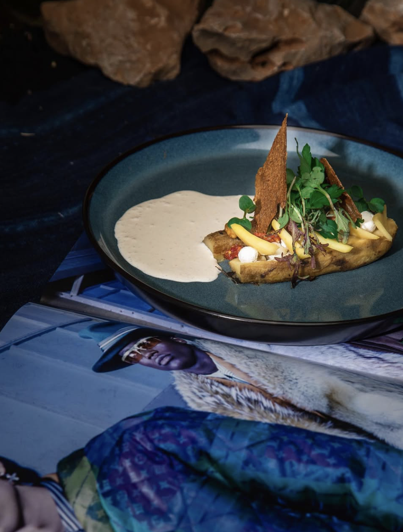 Assiette de tomate revisitée (lentille + lait de coco), aubergine fumée avec pois chiche et chèvre frais (110 MAD) ou dôme de légumes à 120 MAD tout en finesse