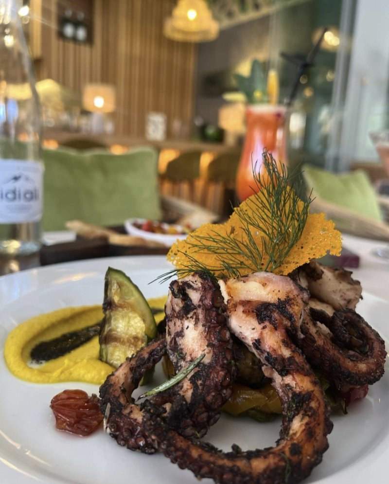 Poulpe grillé : Poulpe grillé, purée de pois chiche et curcuma, légumes façon Kamado. - 170dhs