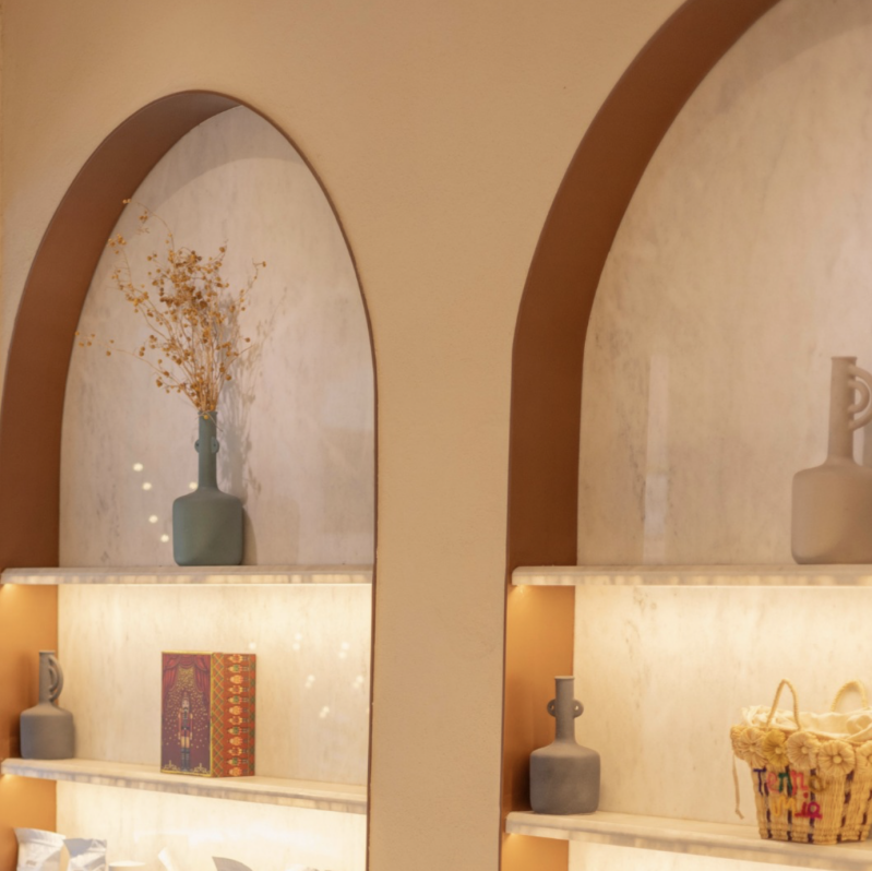 Dès que l'on franchit les portes du Terra Mia Café, on est immédiatement séduit par son ambiance moderne et élégante. La décoration, confiée à Zineb Adyel, une amie d'enfance de la famille, mêle habilement des éléments en marbre et en laiton, créant une atmosphère à la fois minimaliste et chaleureuse. Le fouet cuivré, emblème de la maison, est présent sous forme de luminaires, ajoutant une touche distinctive au décor.