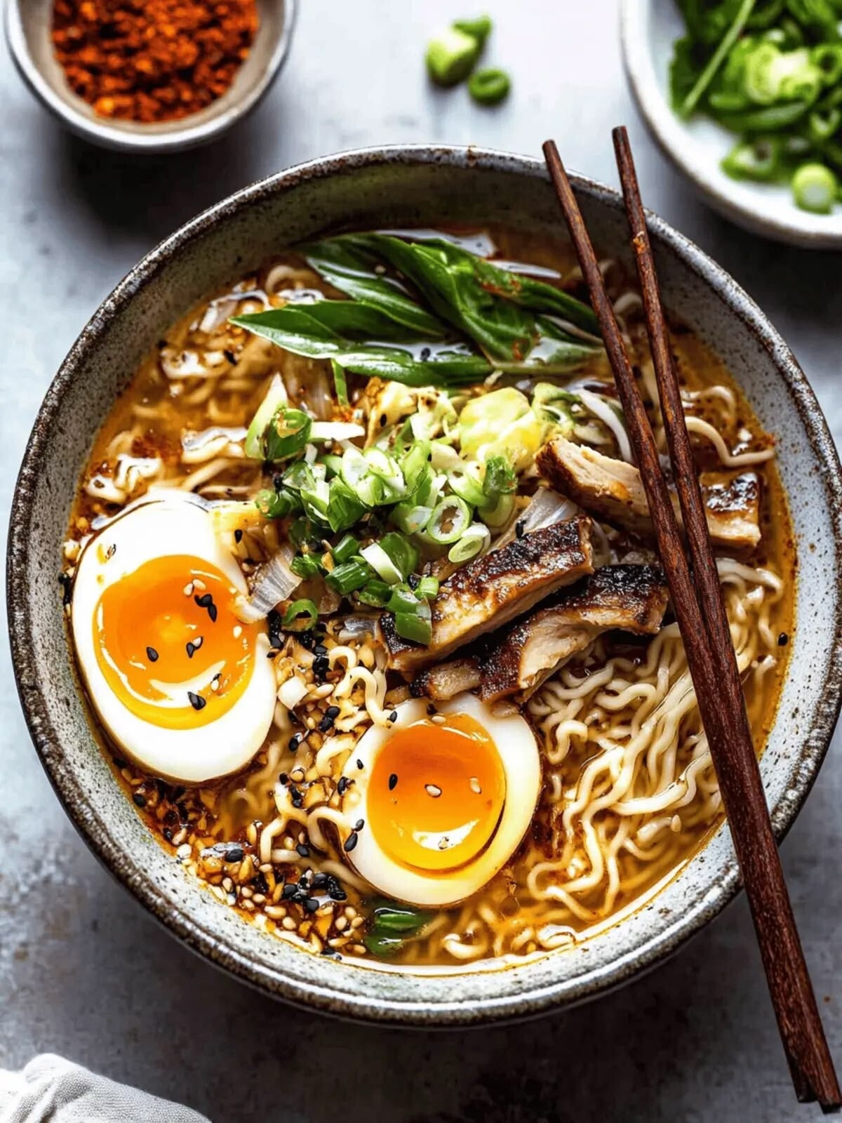 Le ramen au poulet (recette maison facile) se déguste chaud, idéalement avec :