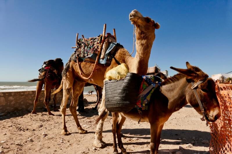 La route étroite qui mène à Sidi Kaouki traverse une belle forêt d’arganiers et de thuya qui descend imperceptiblement vers la mer. Tout au bout de la route : un petit parking peuplé de voitures, de vans Volkswagen et de troupeaux de dromadaires précède une immense plage quasi-déserte. Voilà Sidi Kaouki et son large ruban de sable étendu à perte de vue en direction des côtes méridionales !