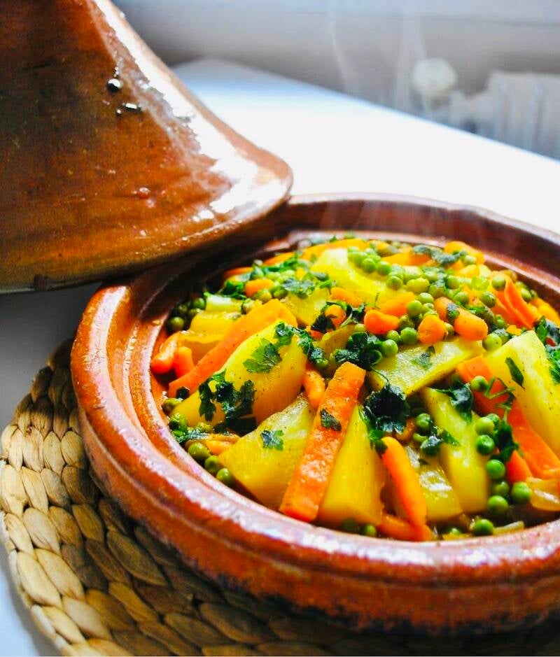 Le tajine est un ragoût traditionnel cuit dans un plat en terre cuite du même nom. Ce plat est généralement composé de viande, de légumes et d'épices, lentement mijotés jusqu'à obtenir une texture tendre et des saveurs bien développées .C’est certainement le plat le plus connu de la cuisine marocaine (avec le couscous). Un tajine est une sorte de marmite en terre cuite à couvercle conique qui donne son nom à une myriade de plats. On peut déguster un tajine de viande, de poulet ou de poisson dans tous les cafés de bord de route, dans les restaurants haut de gamme et dans tous les foyers, et ils sont toujours servis avec du pain.
