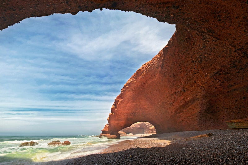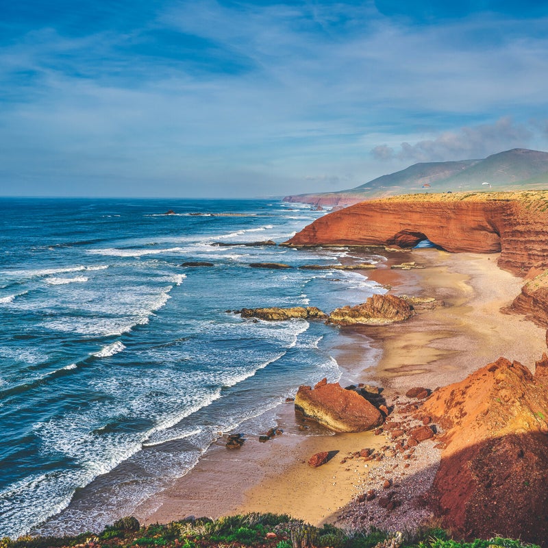 Plage de Legzira (10 km au sud) : célèbre pour ses arches rocheuses impressionnantes (l’une s’est effondrée récemment mais reste spectaculaire) et ses couchers de soleil féériques.