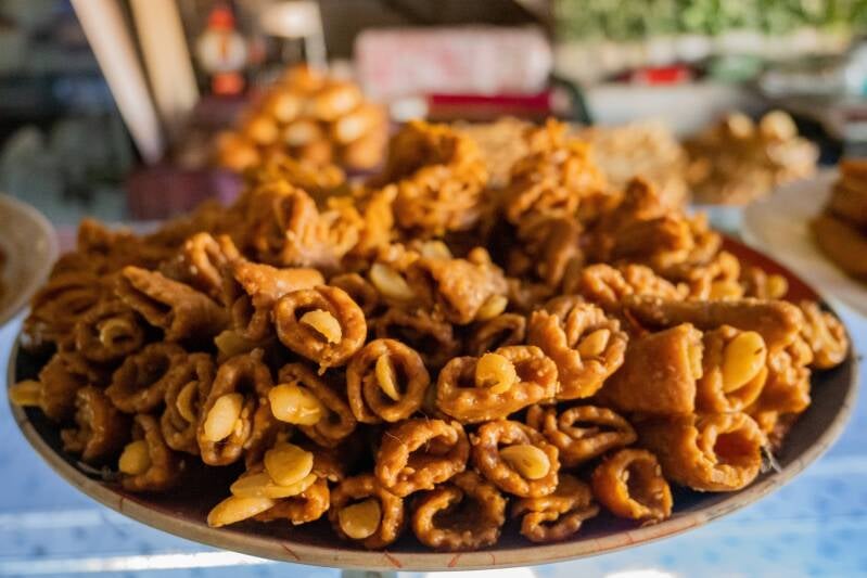 🍽 Description : Gâteau en forme de fleur, frit et enrobé de miel parfumé à l’anis et au sésame.