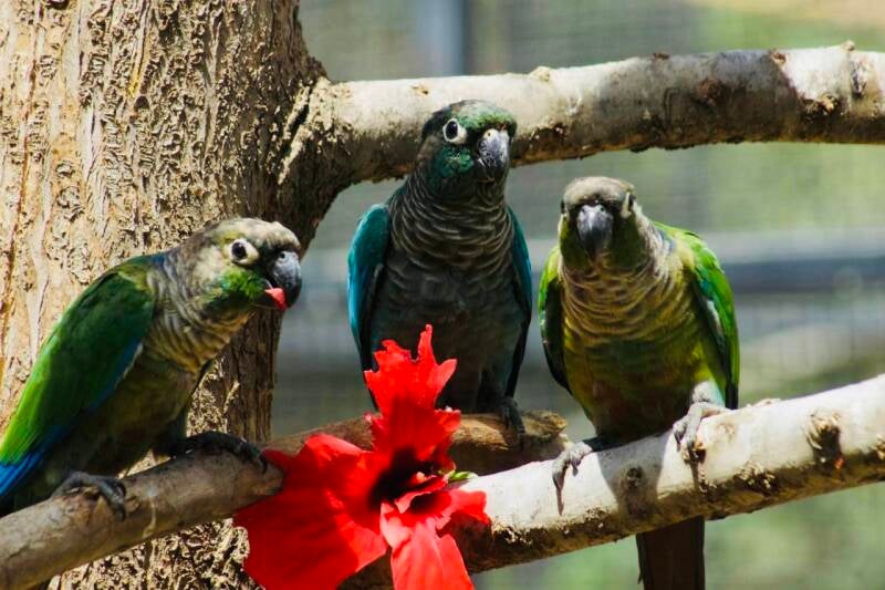 Autruches, cacatoès (plusieurs espèces), Conures, Vautours, Aras rouges et bleus, Bernaches du Canada (sorte d’oies, les plus bruyantes du refuge !), Perroquets, Canards et Faisans argentés par exemple.