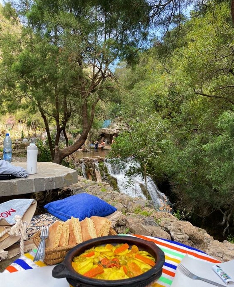 Il y a de nombreux petits endroits avec des chaises où vous pouvez vous reposer et acheter une boisson froide refroidie dans l’eau fraîche de la rivière. Si vous avez faim, il y a aux alentours des petits restaurants en plein air où vous pouvez savourer un petit tajine local.